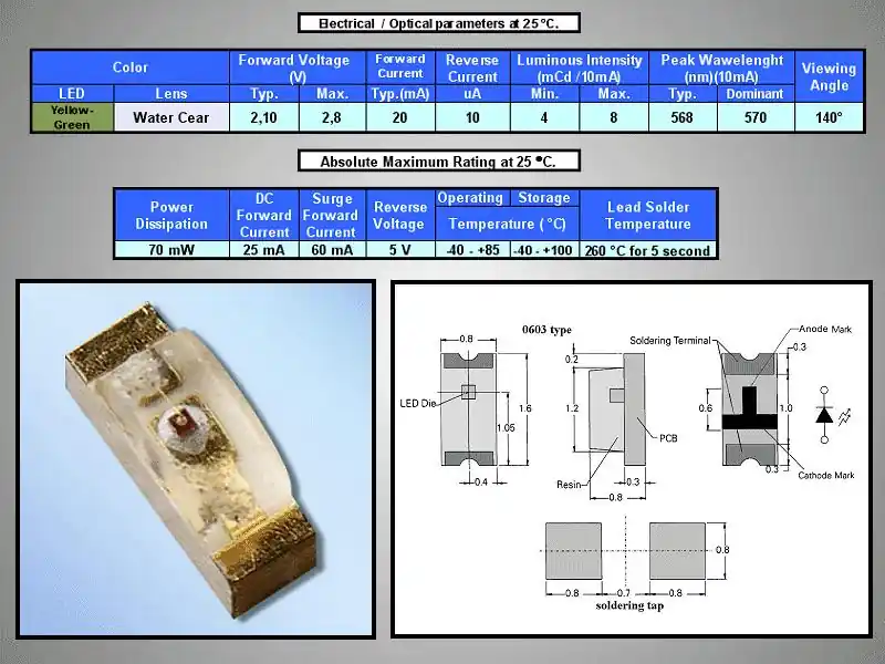 0603 sárgás zöld, víztiszta 4...8mcd LED-SMD G 0008 Autentikus mennyiség