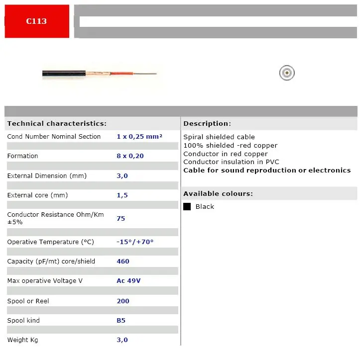 1×0.25mm2 mikrofonkábel, átmérő:3mm 460pF/m