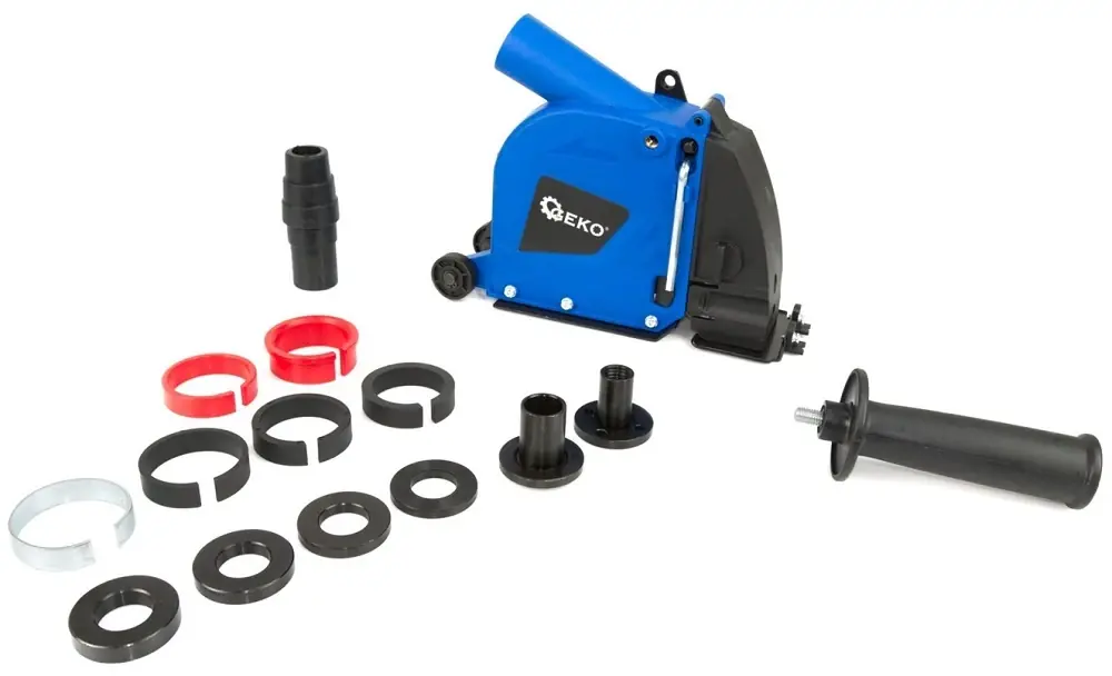 Geko porelszívó szett sarokcsiszolókhoz A porelszívó szett 115 és 125 mm átmérőjű sarokcsiszolókkal használható. A porelszívó két kis kerékkel van felszerelve a hatékonyabb, kényelmesebb és pontosabb munka érdekében. Mélységállítás: 6 / 10 / 15 / 20 / 25 / 28 mmAz adapterek és a speciális rögzítőbilincs lehető veszik 2-4 tárcsák egymástól tetszőleges távolságra történő felszerelését az 5, 6, 7 és 8 mm széles távtartó alátéteknek köszönhetően.Az orsó gallér átmérője 47 mmA csomagban található rögzítő redukciók lehetővé teszik a piacon kapható legtöbb sarokcsiszolóval való munkát. Az adapterek méretei: 38, 40, 41, 42, 43, 48 mmA gumi adapter 28 / 34 / 37 mm belső átmérőjű csövekhez illeszkedikA készlet tartalma:porvédő kerekekkel6 db redukciós adapterHüvelyek tárcsák rögzítéséhez 4 távtartóvalszerelőkulcsH5 imbuszkulcsbecsavarható markolatgumi adapter a porelszívóhoz