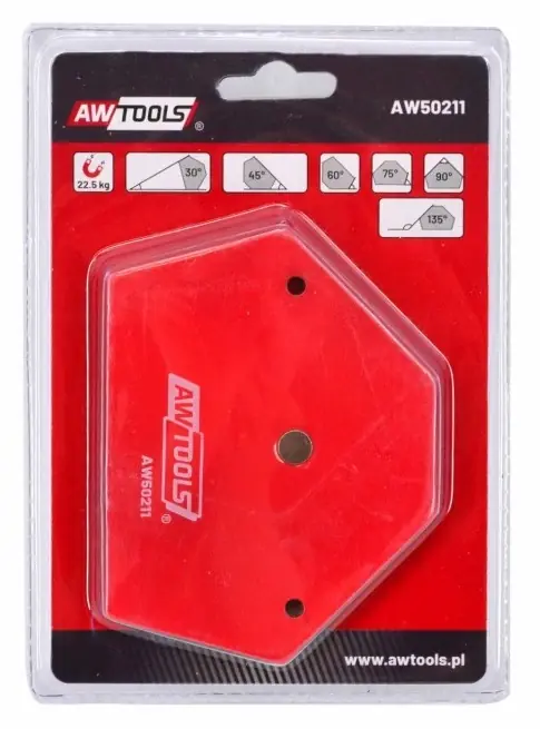 AWTools hegesztőmágnes Erős ferrit mágnesekkel szerelve acél borítással, szegecselt házzal, porszórt bevonattal.Az eszköznek köszönhetően mindkét keze felszabadul, nem kell tartani a hegesztendő darabokat.Úgy tervezték, hogy fémdarabokat többféle szögben legyen képes megtartani a hegesztés alatt. 30°, 45°, 60°, 75°, 90° és 135°