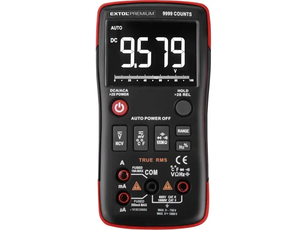 Az Extol Premium 8831251 digitális multifunkciós mérőműszer egyenfeszültség és váltakozó feszültség, egyenáram és váltakozó áram, ellenállás és hőmérséklet mérésére, diódák és tápelemek tesztelésére, valamint áramkörök vezetésének és folytonosságának vizsgálatára szolgál. True RMS funkció: valós effektív feszültség és áramerősség mérése tetszőleges alakú (nem csak színuszos) váltakozó jelek esetében is. A multifunkciós mérőműszer túlterhelés elleni védelemmel van ellátva, ezenkívül automatikus méréstartomány-beállítási funkcióval (Auto Range) , az utoljára mért érték kijelző mezőben történő megőrzése funkcióval (Data Hold), valamint automatikus kikapcsolási funkcióval (Auto OFF) rendelkezik. A multifunkciós mérőműszer figyelmeztető jelzést ad a mérési tartomány túllépésekor, valamint információt ad a tápelemek lemerüléséről. A kijelző mező megvilágításának lehetősége lehetővé teszi a kedvezőtlen látási viszonyok melletti munkavégzést is. A multifunkciós mérőműszer jól használható a műhelyekben, a laboratóriumokban, a háztartásokban stb. 2 db 1,5V AA elemmel szállítjuk.