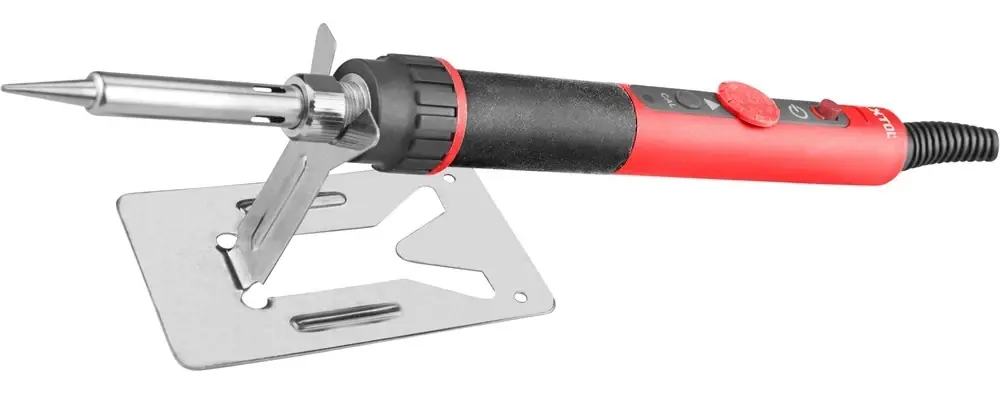 Extol Premium forrasztó páka A hegyes forrasztópákát olyan lágyforrasztásokhoz tervezték, amelyek precizitást és a hegy hőmérsékletének szabályozását igénylik, különösen az elektronika és az ékszerek területén.Megfelelő forrasztóhegy használatával a forrasztópáka műanyag finom vágására vagy illesztésére, valamint szimbólumok fába égetésére is használható.A szabványos 900M hegyek használhatók.A forrasztópáka hegyét egy belső fűtőelemmel ellátott kerámia test melegíti. Ezután egy hőmérséklet érzékelő biztosítja a visszacsatolást, és a forrasztópáka a forrasztás során tartja a beállított hőmérsékletet a 100-480°C közötti tartományban. Manuálisan beállítható hőfok vezérlés.A forrasztópáka fel van szerelve egy hegyhőmérséklet-kalibrációs funkcióval, amellyel az új hegy hőmérsékletét a méretéhez képest újra kalibrálhatja.33 másodperc alatt eléri a 350°C-ot.A készülék ESD védelemmel is rendelkezik a statikus elektromosság kisülése ellen.A fém és a műanyag részek közötti műanyag átmenet speciális, nagy hőállóságú műanyagból készült, a markolat pedig szilikonbevonatú a kényelmes fogás érdekében.A forrasztópáka elrakásához egy egyszerű állványt is tartalmaz.