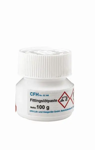 Használatra kész lágyforrasztófémpaszta előónozáshoz és rézcsövek lágyforrasztásához.CFH-No. 52339 és 52340 jelű fittingónnal együtt használandó.DIN EN 29453, DIN EN 29454.1- 3.1.1.C (F-SW 21), S-Sn97Cu3100 g-os tégely