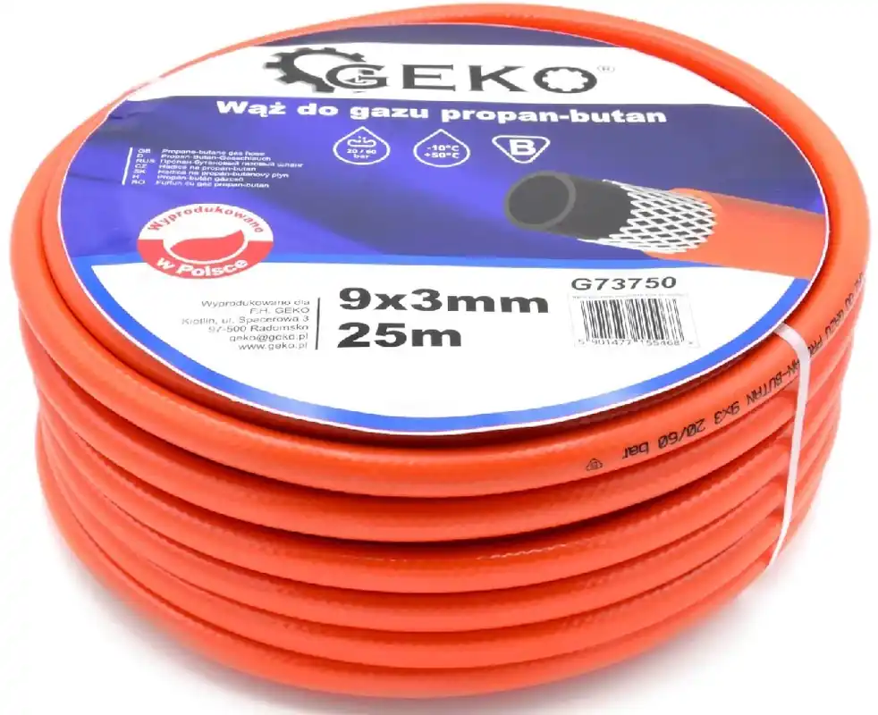 Geko propán-bután gáztömlő Propán-bután gáztömlő. A tömlő PVC-ből készült gumi hozzáadásával, poliészter hálóval megerősítve. A termék rendelkezik tanúsítvánnyal a háztartási gázpalackok csatlakoztatásához.