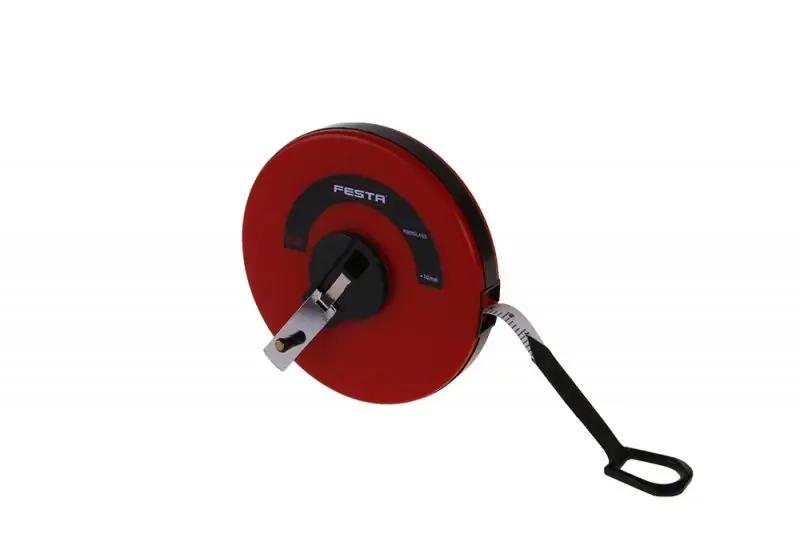 Minőségi és precíz üvegszálas mérőszalag EECSzakadás elleni gumis fűzőlyukkal végződő szalagCE tanúsítvány – kalibrálásra alkalmas, lehajtható tekercselő fogantyú, hurok.