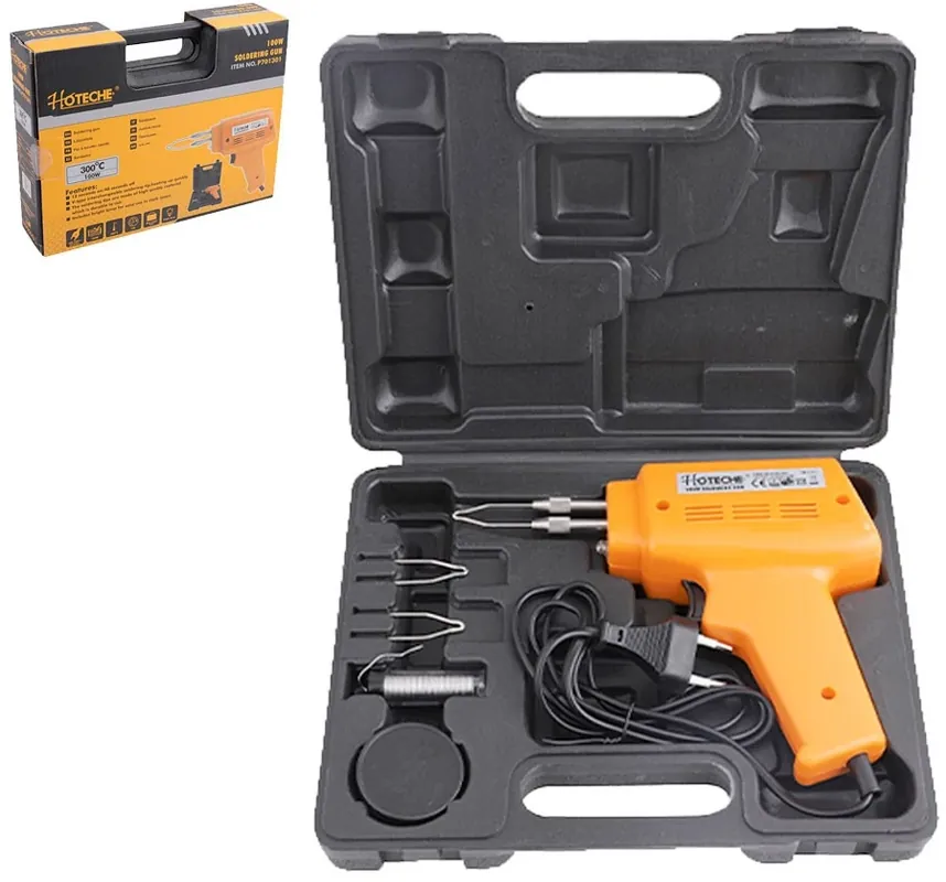 Hoteche forrasztópisztoly Ismerd meg a forrasztás művészetét a HOTECHE forrasztópisztolyával!Ez a kiváló minőségű eszköz remek választás bármilyen forrasztási feladatra, amire szükséged lehet munkáid során.A tartozékokkal teli koffer ideális kísérő lesz a műhelyedben vagy otthonodban.A 100W teljesítmény biztosítja a hatékony és gyors forrasztást, míg a praktikus koffer megkönnyíti az eszközök tárolását és szállítását.Szilikon vezetékkel és csatlakozóval
