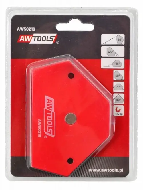 AWTools hegesztőmágnes Erős ferrit mágnesekkel szerelve acél borítással, szegecselt házzal, porszórt bevonattal.Az eszköznek köszönhetően mindkét keze felszabadul, nem kell tartani a hegesztendő darabokat.Úgy tervezték, hogy fémdarabokat többféle szögben legyen képes megtartani a hegesztés alatt. 30°, 45°, 60°, 75°, 90° és 135°