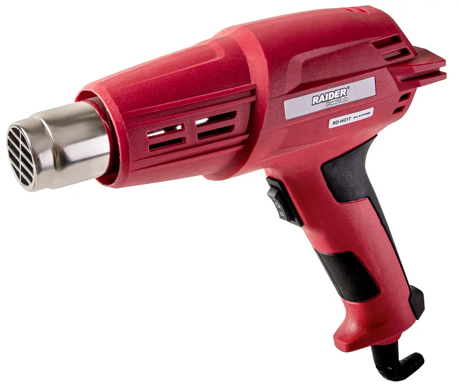 Raider RD-HG17 hőlégfúvó2000 W-os motorral.A levegő hőmérséklete 2 fokozatban állítható.1. fokozat 350 °C2. fokozat 550 °CA légáramlás volumene 2 fokozatban állítható.1. fokozat 300 l / perc2. fokozat 500 l / perc