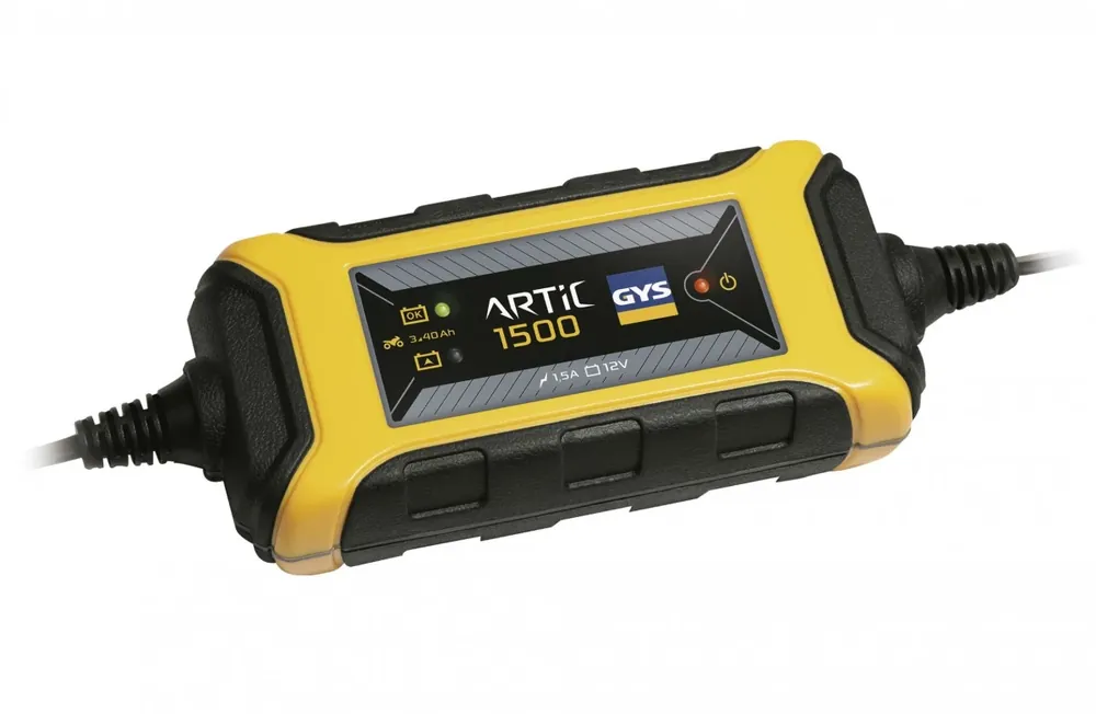 Inverteres akkumulátortöltő1,5A/40 Ah – 12VKifejezetten motorok, jet-skik, kartingok, quadok vagy fűnyírók 12V-os akkumulátorának töltésére fejlesztették ki, az ARTIC 1500 (1.5 A) mikroprocesszorral ellenőrzött, autómata töltést biztosít.Hatékony, kompakt és könnyű, 2-szer olyan gyors, felügyelet nélküli töltést garantál, mint egy hagyományos akkumulátortöltő.Ideális motorokhoz és városi kis autókhoz12 V-os (savas-ólom) 3 – 40 Ah kapacitású akkumulátorok töltésére lett kifejlesztve, egyben a töltöttségi állapot fenntartását is lehetővé teszi 100 Ah-ig.Fenntartja az optimális töltöttséget, korlátlan ideig az akkumulátorra kapcsolva maradhat az áttelelés idejére. «Auto Restart» funkció áramszünet esetére a beállítások memorizálásával.Plug & Play rendszer (kapcsold be és használd)Egyszerüsített, gombmentes kezelőfelület a hibás manipuláció elkerülése érdekében. A rákapcsolást követően, az ARTIC 1500 azonnal elkezd tölteni, a felhasználó beavatkozása nélkül, ha az akkumulátor feszültsége nagyobb, mint 7V. 100% -os automata töltésA felügyelet nélküli töltés és karbantartás maximális élettartamot és teljesítőképességet biztosít az akkumulátor számára. Beépített védelem Védi a jármű elektronikáját : rövidzárlat, fordított polaritás és túlterhelés elleni védelem. Szikraképződés elleni védelem.Automata készenléti állapot, ha az akkumulátor le van csatlakoztava. Ergonomikus Kompakt design, könnyű és hordozható.Csatlakozás gyorscsatlakozóval.Por- és folyadék ellen (IP65) teljesen, hermetikusan zárt, ütésálló ház. Használati javaslatMotorok, jet-skik, kartingok, quadok és fűnyírók, városi kisautók