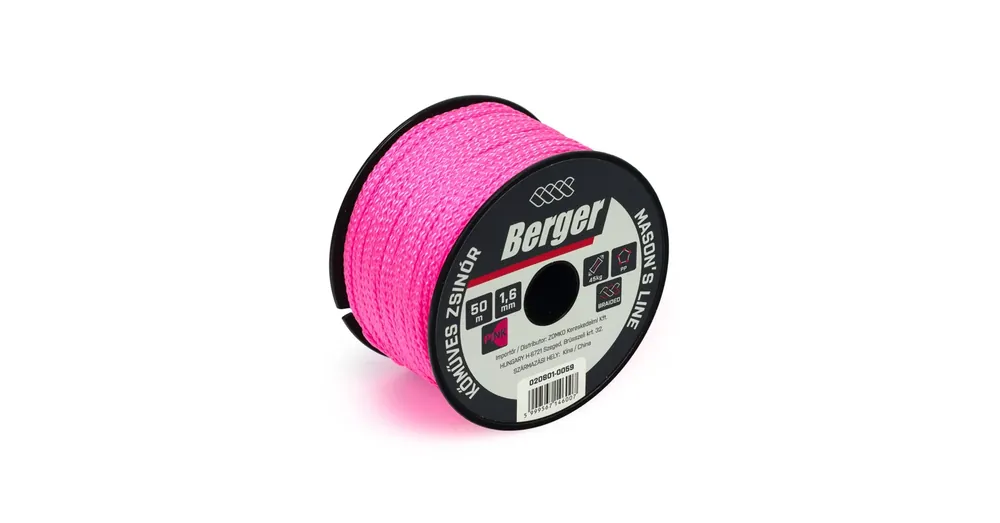 • Polipropilén műanyag dob• 1,6mm vastag fonott poliészter zsinór• ~45 kg szakítószilárdság• 50m hosszú zsinór• Élénk fluoreszkáló pink szín• Kompakt kis helyen is elfércikkszámzsinór hosszúság (m)zsinór vastagság (mm)szálak száma (db)020801-0059