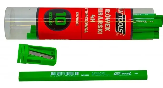 AWTools ácsceruza téglához Téglalap keresztmetszetű, 4H ácsceruza.Tartós és tiszta vonalak meghúzására tervezték.Tökéletes téglához, kőszerű anyagokhoz, kőműves munkákhoz.Könnyen hegyezhető a ceruzabél eltörésének veszélye nélkül.Univerzális hegyezővel szállítva.