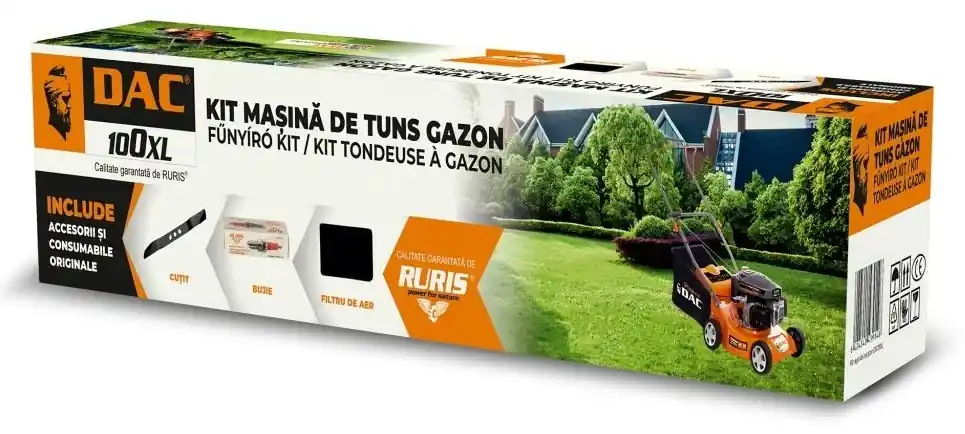 DAC 100 XL fűnyíró készletA szett tartalmazza a fűnyíró karbantartásához szükséges alkatrészeket, amelyek cseréje nagy gyakorisággal történik.A készlet segítségével a készülék használója biztos lehet abban, hogy sokáig tudja élvezni 150XL fűnyíró teljesítményét.A készlet tartalma:mulcsozó késgyújtógyertyalégszűrőékszíjcsavarhúzóKompatibilis a Ruris DAC 100XL fűnyíróval.