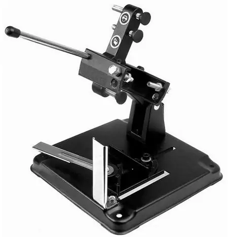 Sarokcsiszoló állvány 115 és 125 mm korongátmérőjű sarokcsiszolókhoz egyaránt. Alkalmas otthoni felhasználásra. A sarokcsiszoló állványt a munkapadhoz rögztve és a sarokcsiszolót az állványba fogva alkalmas fémek precíz darabolására.