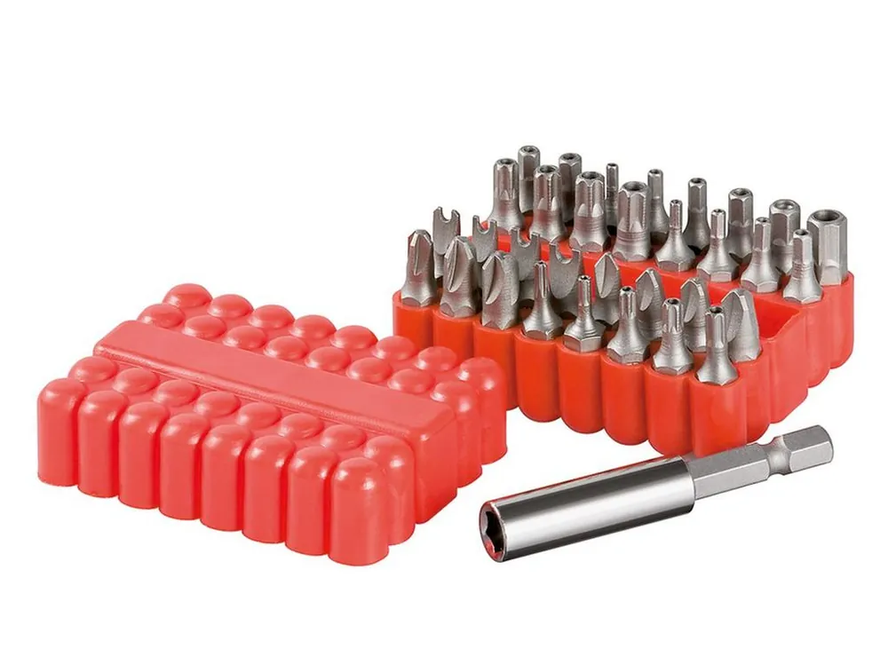 Fixpoint bit készlet 33db-os szerszámacél bit csomag bliszteres prémium CrV-ből (szerszámacél) tartalom:1 db 6,35 mm-es mágneses bittartó 12 db hatszögletű bitek (2; 2,5; 3; 4; 5; 6; 1/8; 3/32; 5/32; 5/64; 7/64; 9/64); 4 db háromszárnyú bitek (1-2-3-4); 3 db Philips-bitek (6-8-10); 4 db speviális bitek (4-6-8-10); 9 db furattal rendelkező torx-bitek (T8, T10, T15, T20, T25, T27, T30, T35, T40)rugalmas puha gumi dobozban