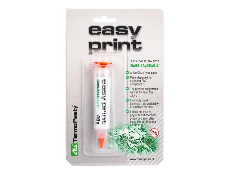 Paszta SMD alkatrészek forrasztására olyan gyártási folyamatokban, amelyek nem tartalmaznak mosási fázist. „No clean” folyasztószeren alapul, amely nem igényel tisztítást és maradványai nem okoznak korróziós központokat. A termék minden ólommentes ötvözettel együttműködik, jó tapadósságot és a forrasztott felület nedvesíthetőségét mutatja. Fizikai és kémiai tulajdonságait nem veszíti el még azután sem, hogy 20 órán át a PCB-n áll. Ez az idő a helyiség körülményeitől függ: páratartalom és hőmérséklet.