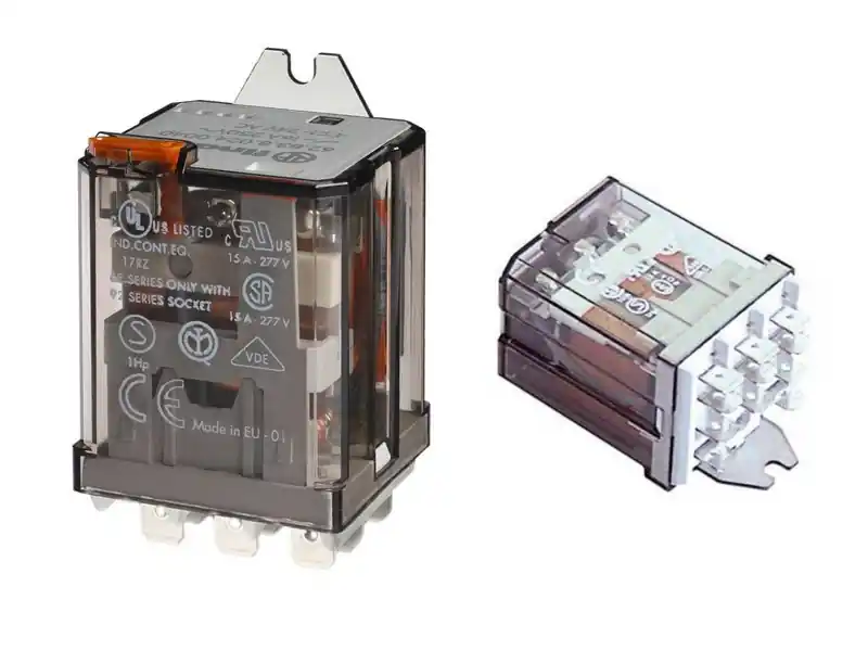 Relé 3x250V 16A/30A 230VAC (sarus 6,3), 628382300040. Zárható tesztnyomógomb és mechanikus kapcsolási állapotjelzés.
