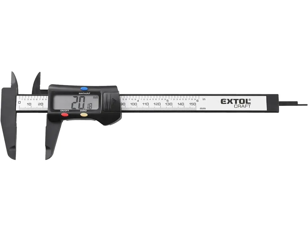 Extol digitális tolómérő, mélységmérővel, műanyag, 0.01×150mm, pontosság ±0,2 mmA digitális tolómérő kijelzője 0,01×150mm felbontású, pontossága: ±0,2 mm. Az átkapcsoló gombbal lehet váltani a milliméterben és a hüvelykben történő mérés között. Folyadékkristályos kijelző. A tolómérő műanyagból készült. A műanyag tároló védi a mérőeszközt használatkor és tároláskor. Mélységmérővel rendelkezik.