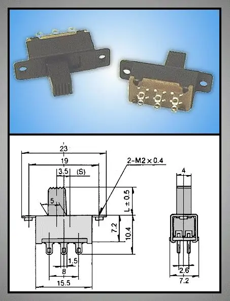 SLIDE kapcsoló 2x3p. 23×7.2mm (2 circuit) 500mA 24Vdc. Tolókapcsoló 2x3p. 23×7.2mm (2 áramkörös) 500mA 24Vdc.
