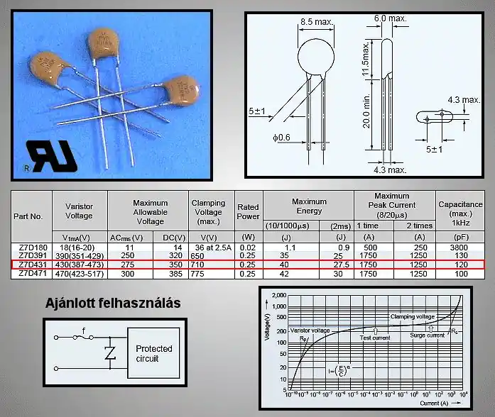 Utolsó esély VARISZTOR 430V 1200A (1750Ap max: 20us) PVR07D431