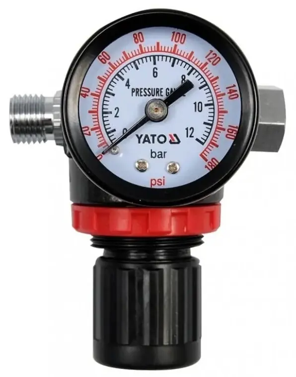 Yato nyomáscsökkentő szelep nyomásmérővel1/4″-os csatlakozókkal ellátott szelep, mely a levegőtartályokból kiáramló maximális nyomást csökkenteni tudja arra a szintre ami a levegős szerszámaink működtetéséhez szükséges.