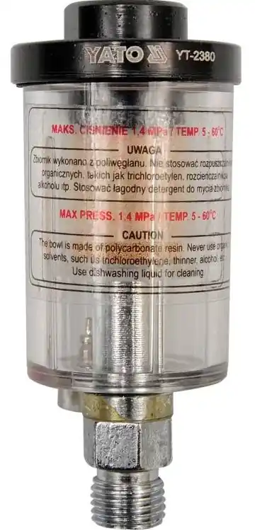 Yato Levegőszűrő 8cm3-es tartállyal.A kompresszor által előállított nyomás következtében a sűrített levegőből kicsapódó pára, nedvesség szűrésére szolgáló eszköz. Ugyanis amennyiben ez a nedvesség bejutna levegővel működtetett szerszámaink dugattyúiba, korróziót, meghibásodást okozhatna. Ezt viszont szeretnénk elkerülni. Erre 2 lehetőségünk van, az egyik a levegőszűrőnk rendszerbeiktatása, a másik pedig a folyamatos, rendszeres olajzás. A legjobb az, ha mindkettőt alkalmazzuk.Telepítés:Helyezze a készüléket függőleges helyzetbe, a tartállyal lefelé. Győződjön meg arról, hogy a csatlakozás szoros.Helyezze a szűrőt a pneumatikus rendszerben a lehető legközelebb ahhoz az egységhez, amelybe a szűrt levegőt kell juttatni.Kerülje a közvetlen napfénynek, magas hőmérsékletnek és maró hatású vegyi anyagoknak való kitettséget.A víztartályt a vízleeresztő szelep alatt kell elhelyezni, hogy a víz le tudjon folyni.Beállítás:A víz leeresztése. Ha a készülék nincs nyomás alatt, a víz automatikusan lefolyik.Amikor a készülék nyomás alatt van, nyissa ki a tartály alján található leeresztőszelepet a víz leeresztéséhez.Ha a vízszint meghaladja a maximálisan megengedett tartományt, nyissa ki a leeresztőszelepet, és engedje ki a vizet. Ez fenntartja az áramló levegő optimális párásodását.KarbantartásKapcsolja ki a levegőellátást, engedje ki a pneumatikus rendszerben nyomás alatt felgyülemlett levegőt a légkörbe.Fordítsa a tartályt az óramutató járásával ellentétes irányba. Fújja ki a szűrőt tiszta sűrített levegővel. Tisztítsa meg a tartály belsejét puha, száraz ruhával.Ne használjon semmilyen oldószert vagy más olyan anyagot, amely károsíthatja a polikarbonátot.A tartály rögzítőgyűrűjének felcsavarozása előtt győződjön meg arról, hogy a tömítés a helyén van és nem szennyezett.