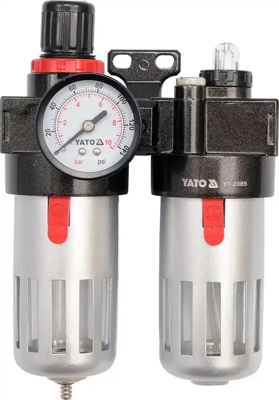 Yato falra szerelhető nyomásszabályzó, mérőórával, levegőszűrővel, és olajzótartállyal. Bemenete és kimenete egyaránt 1/4″-os mérettel rendelkezik.Maximálisan 10bar, 140psi, és 0,93MPa nyomást tud közvetíteni.Levegőszűrő tartálya 90cm3 térfogatú, mely egy csepegtetőszeleppel a leválasztott párát el is vezeti.Emellett rendelkezik még egy 60cm3 térfogatú olajzótartállyal, szerszámaink védelmére.Üzembehelyezésnél, bekötésnél figyeljünk az áramlási irányra, ne cseréljük fel! Tartályainak védelme érdekében két fém burkolatot is kapott.Két tartálya polikarbonátból készült, tisztítására ne használjon oldószeres tisztítószert.