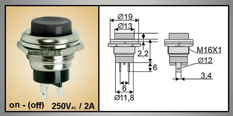 Zárt nyomó kapcsoló fémházas (fekete) 2A 250V ON-(OFF)